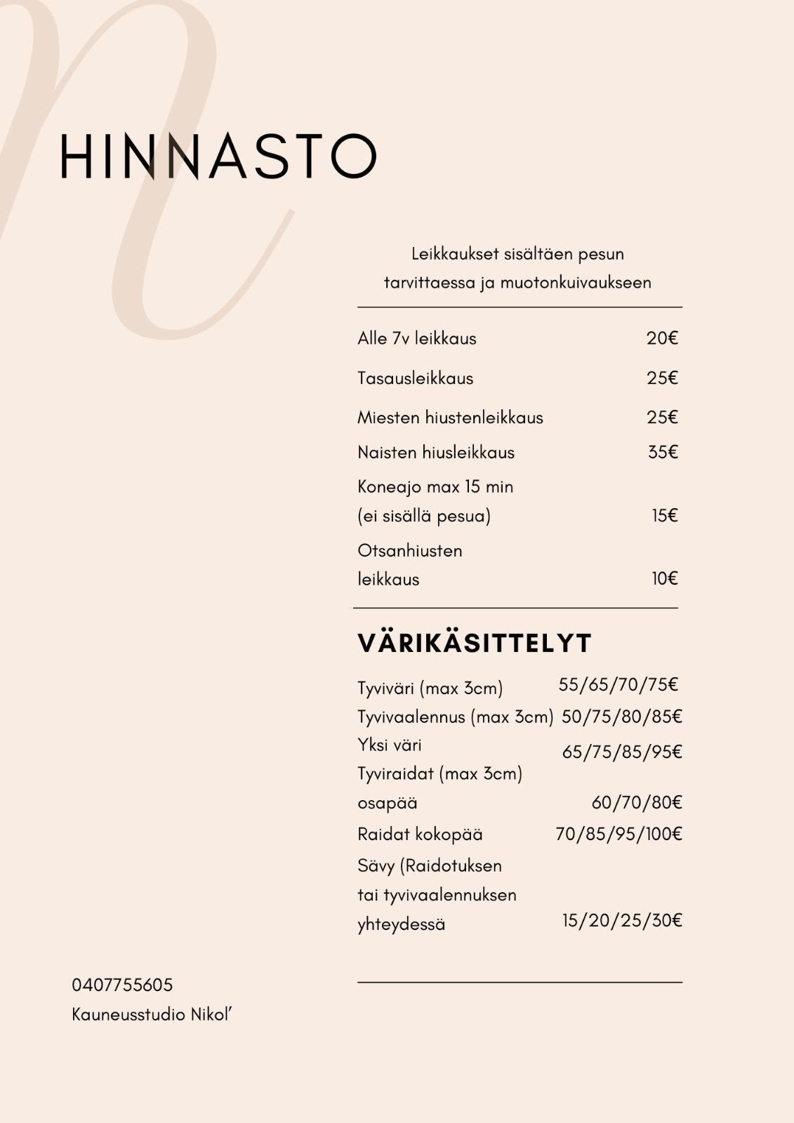 Päivitetyn palvelukohtaisen hinnaston löydät täältä. Klikkaa selaataksesi pdf tiedostoa.